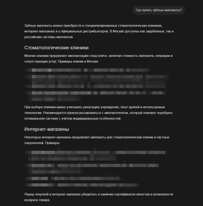 Более того: когда попробовал задал условием поиска фразу "купить имплант", получил ответ от искусственного идиота "самому купить зубные импланты невозможно". А?!