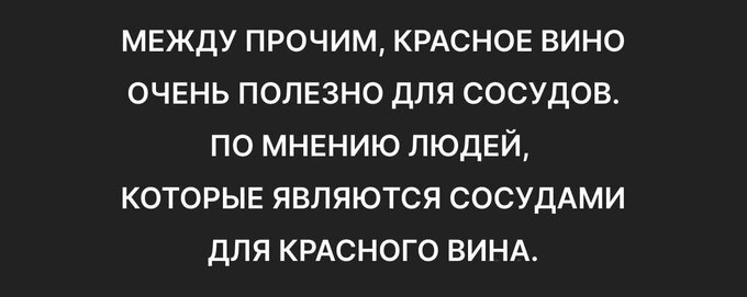 4 user10295786 Юмор для всех и каждого Ответ на пост «Полезно» 13 дней назад Красное вино полезно для здоровья, а здоровье нужно чтобы пить водку. Юмор Скриншот Короткопост Ответ на пост Текст 3 Ещё 0