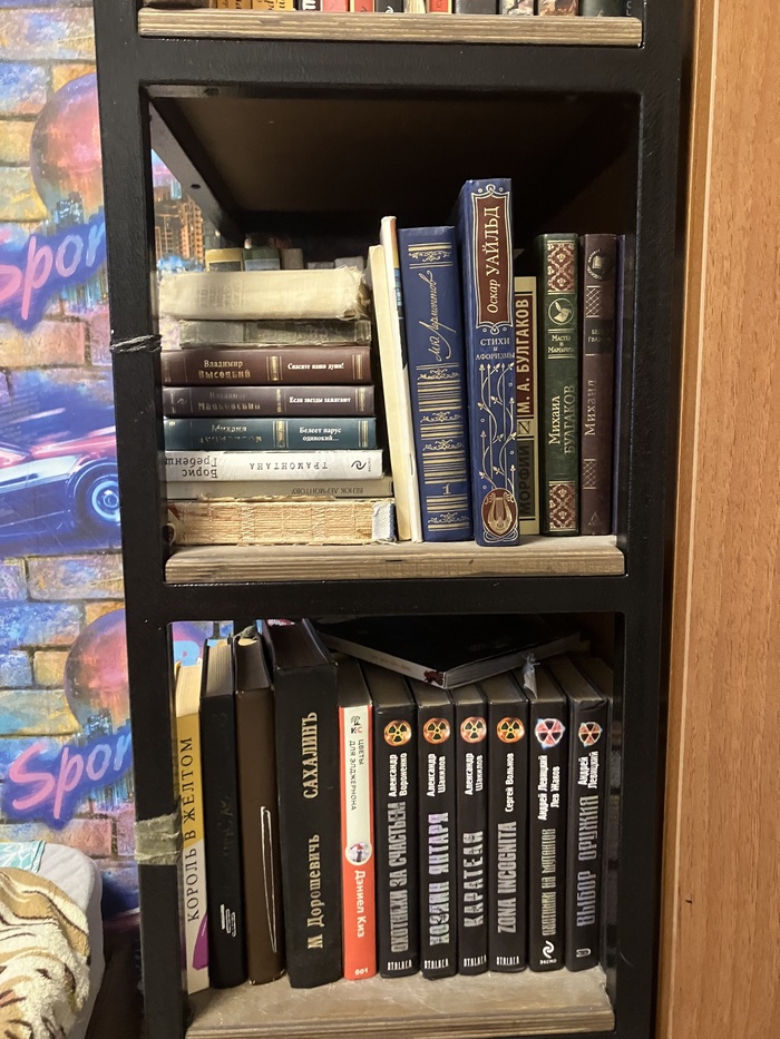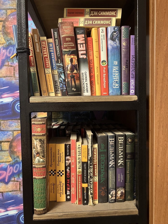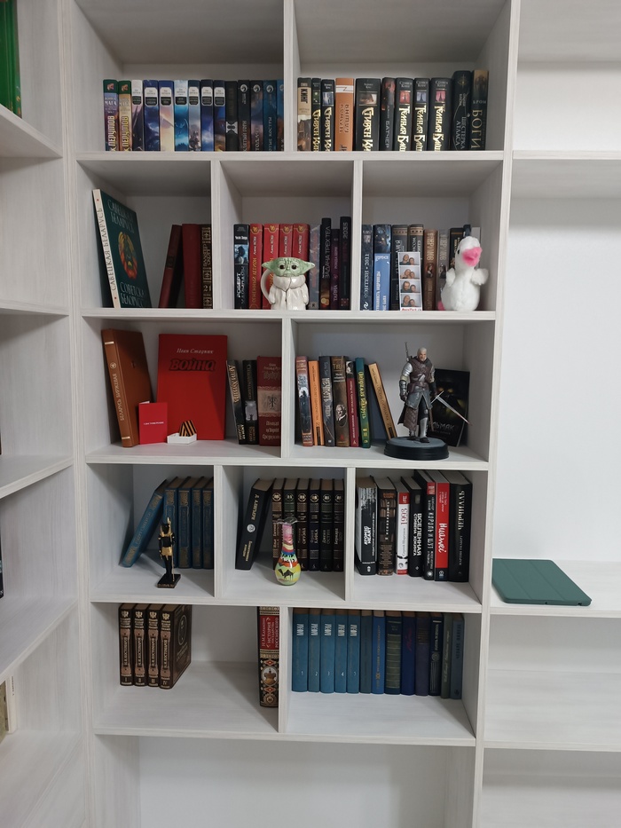 Собирал на протяжении 8 лет (собственно, как начал активно читать). Серий каких-либо не вышло собрать, но особо горжусь советскими сборниками разномастной фантастики. Собственно львиная доля книг здесь фантастикой и является, немного классики, фэнтези, детективов и различной современной бульварщины, которую очень любил в начале своего читательского пути. Эх, нужна вторая полка…