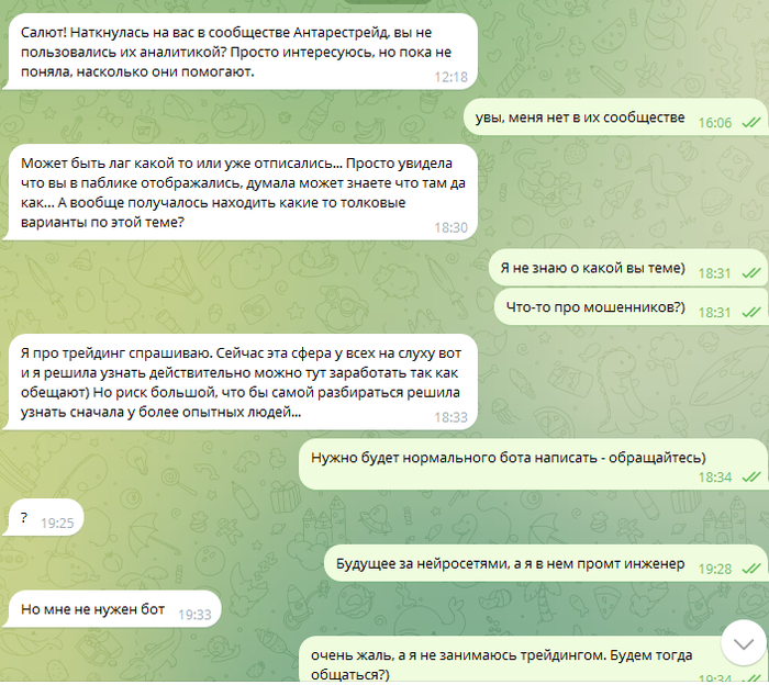 Далее вполне невинно и правдоподобно не понимает в чем суть, какой бот. Рассказывает что в разводе, что у нее мечта открыть ресторан. Сама вопросы задает. Легкий бла-бла ни о чем.