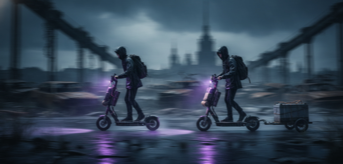Саня ударил по тормозам, самокат чуть повело юзом по скользкой грязи. Игорь тут же погасил фару и жестом показал: «К стене». Они быстро, но без суеты закатили технику под бетонный козырек какой-то заброшенной проходной.