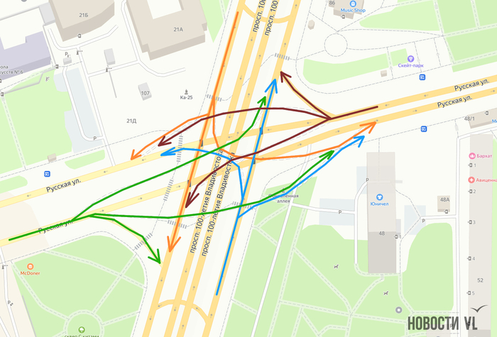 Есть во Владивостоке проблемный перекресток, Русская -100 летия. Даже в самый тихий день, там всегда ужасные пробки. Авторадио, когда говорит о пробках на дороге, говорит, что пробок почти нет, кроме Русской. Ну а в обычные часы, даже не час пик, там можно стоять по часу.