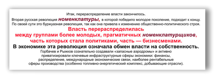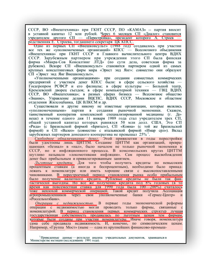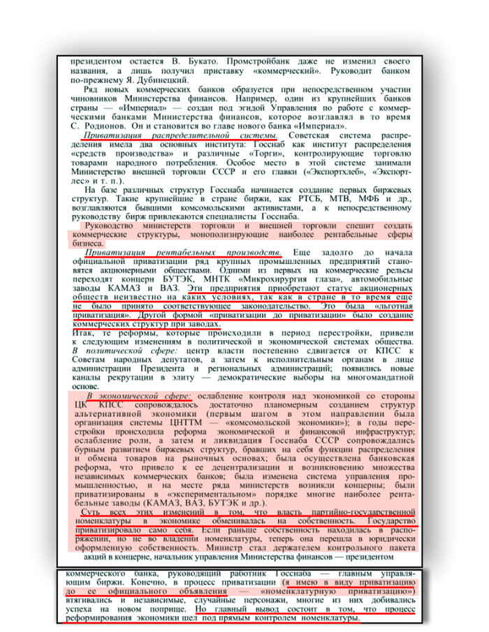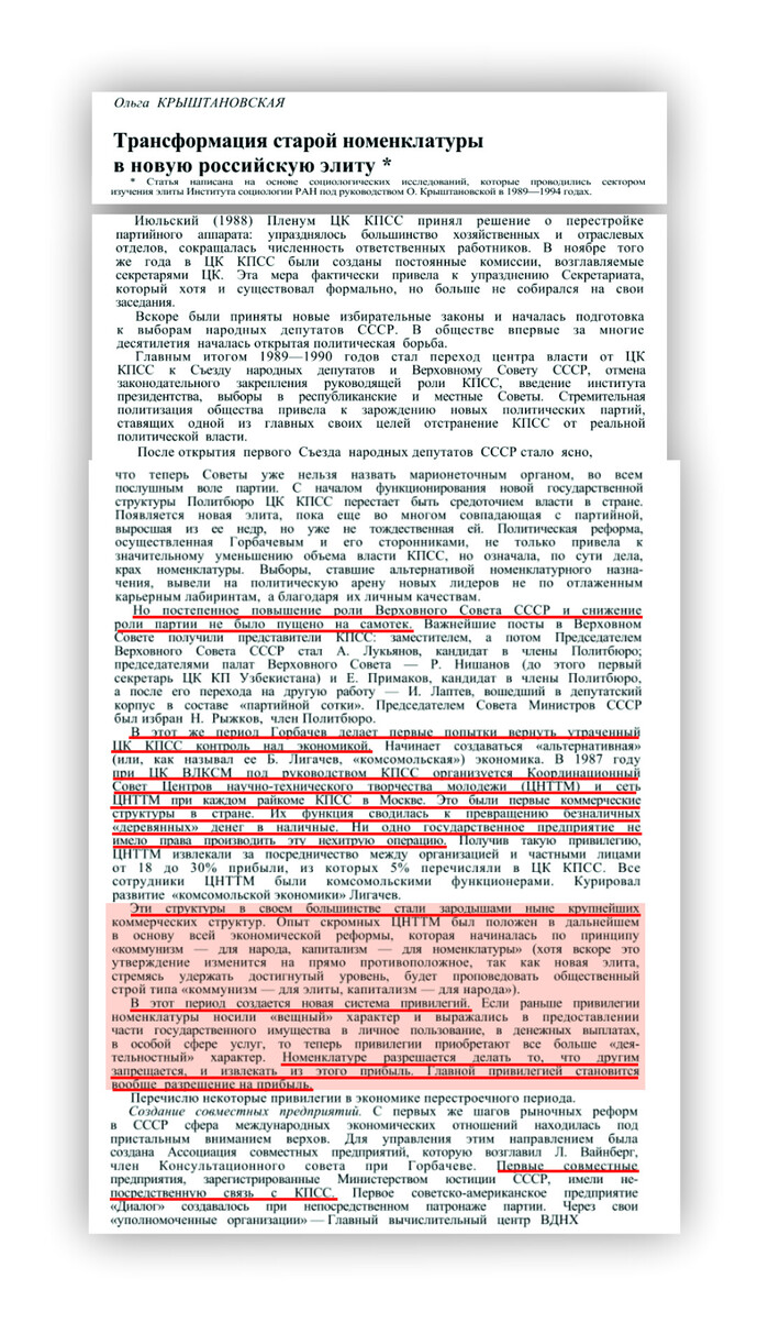 Далее будут представлены скрины статьи "Трансформация старой номенклатуры в новую российскую элиту" написанной на основе социологических исследований, которые проводились сектором изучения элиты Института социологии РАН под руководством О. Крыштановской в 1989—1994 годах. В текстах скринов, достаточно подробно и предельно доходчиво, разъясняется, каким образом, и с какой целью, начиная с 1987...1989гг, РиН организовала и запустила латентную (без каких бы то ни было законодательно утверждённых правил) номенклатурную приватизацию самых лакомых государственных активов. Ваучерная приватизация прохиндея Чубайса, законодательно оформленная и стартовавшая в 1992 году, нервно покуривает в сторонке..