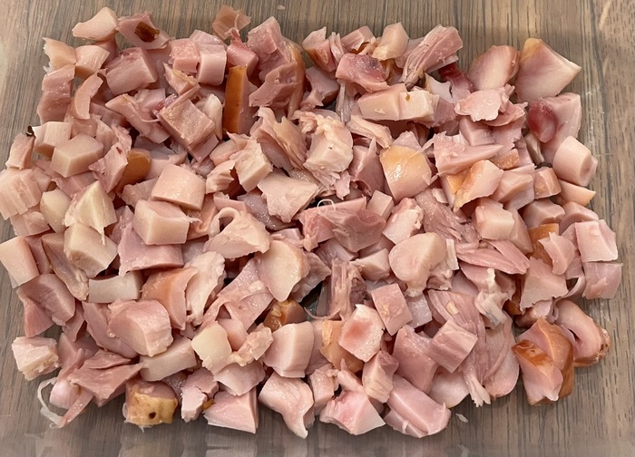 Куриный окорок копченый (продается обычно под вакуумом упакованный) - ~0.5 кг включая кости. Допустима грудка.