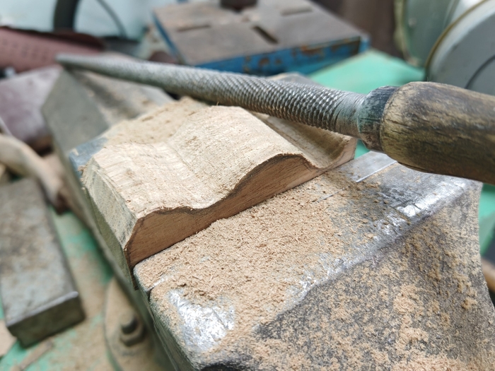 В этот раз при работе стамески не применял. Понял, что проще сначала выпиливать лишнее пилой, потом рашпилем доводить к примерным очертаниям, далее напильник, потом наждачки от Р80 до Р600 и в конце наматывал на напильники брезент и полировал им. В остальном процесс такой же, как у предыдущего.