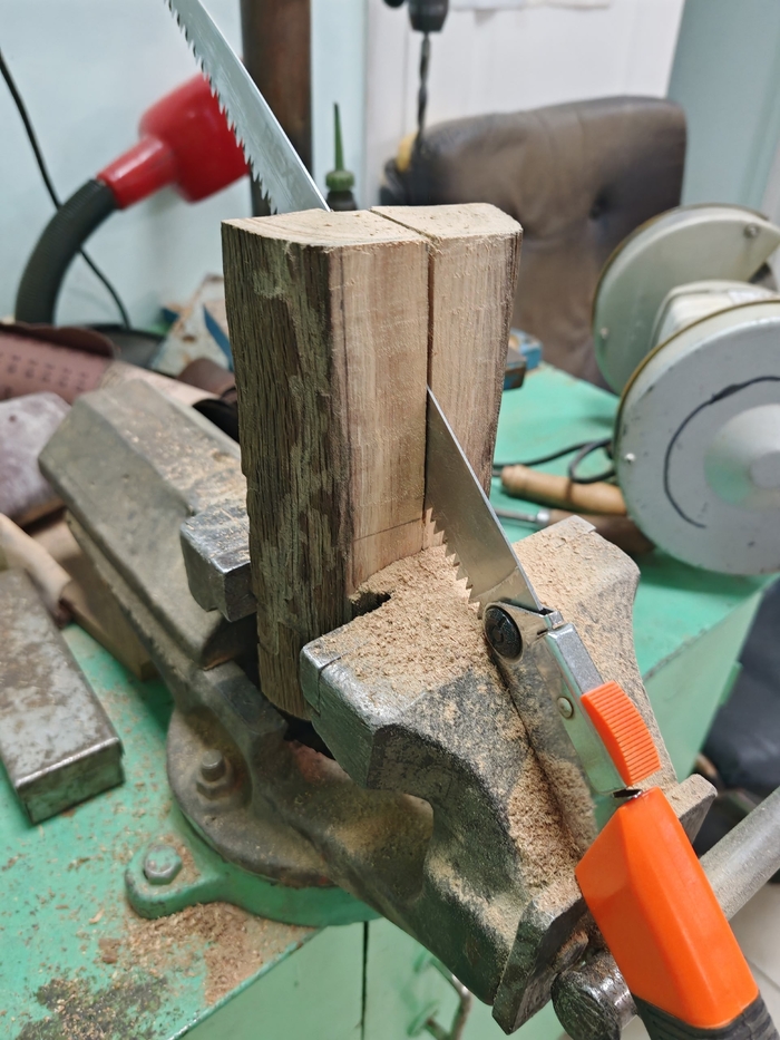 Результатом вылазки стала добыча дубового бревнышка диаметром около 12см. При заносе в отапливаемое помещение, сразу появилась трещина от центра. Расколол его пополам зубилом с молотком, топора под рукой не было. Ну и начал выпиливать заготовку.