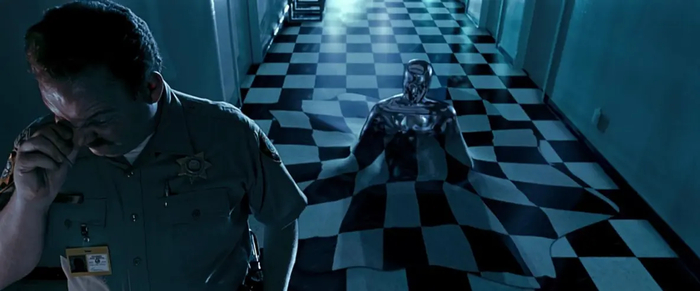Но самое страшное, Т-1000 может стать кем угодно. Твоей матерью или твоим самым близким другом. Он может быть полом под твоими ногами. Стеной, к которой ты прислонился. Дверью которую ты сейчас собераешься открыть.