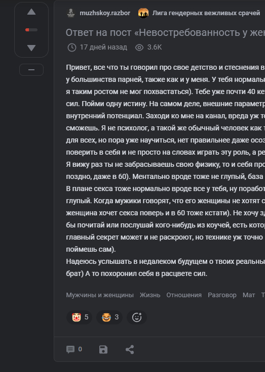 Мне вот интересно, почему у авторов всех этих проектов а-ля "Мужицкие советы о том, как быть мужицким мужиком" почти все всегда крутится вокруг секса? Постоянно "Почему она тебе не дает? Как сделать так, чтобы она тебе дала? Как не быть удобным, чтобы она тебя захотела" и вот это вот все. Других тем нет что ли? Какие свои комплексы эти авторы так пытаются компенсировать?