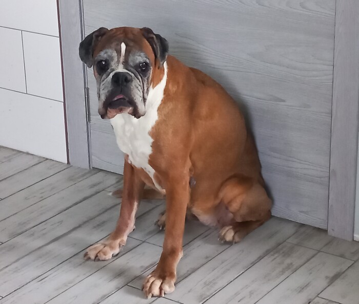Собачья деменция..., да, у нас тоже была у одной из боксёрок. Сначала стала таскать со стола, никогда в здравом уме она себе этого не позволяла, даже мыслей не было. Стала вести себя как вредная старушка), это было очень умилительно - спорила с нами, ей чего-то говоришь или запрещаешь, а она начинает бубнить и пытается доделать начатое. Могла дома напрудить после прогулки, ну забыла зачем вышла). Стала домагиваться до наших котов в доме - нельзя им стало, по её мнению, спускаться на первый этаж, хотя раньше дружила, ну и как в щенячестве начала охоту на их какахи, пытаясь пробраться на второй этаж к их лотку, пришлось перегородку на лестнице укреплять. Ну и слух и зрение просели конкретно. Мы даже её ласково стало называть Деменцией, а не Рейной). Ушла на радугу в 13 лет. Сейчас её сыну 11, пока держится). Не смотрите, что он в платочке, он не сам надел, его заставили.