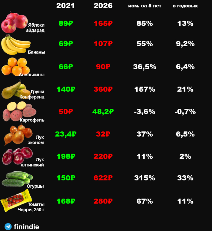 Топ-3 подорожавших товара: Огурцы, Сливки, Груша Конференц. В огурцах иксы, мечта биржевого воротилы! +315% за 5 лет или 33% годовых.