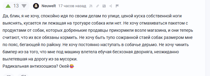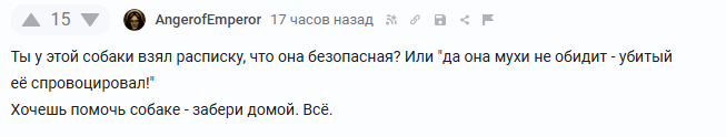 Так вот на этом сайте адекватных людей меньшинство. Большую часть набирают радикальные анти-зоошизки. Который похрен на общую и частную ситуации, которые видят слово "собака" и орут "уничтожить".