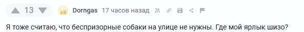 Я открыто выступаю против стай, против агрессивных собак. Я за безопасность людей. И я это пишу уже третий пост, я это не скрываю. Но для человека я все равно "шиза", ведь я не разделяю его позицию по истреблению вообще всего. Ведь я считаю, что отдельные собаки безопасны и достойны жалости. Ведь я считаю, что собаки - тоже живые существа, и их истребление - это крайняя мера, когда опасность для людей уже явно выраженная. Что собаки не виноваты в том, что их выгнали на мороз, что надо не просто всех уничтожать, а прорабатывать законы и устранять причины.