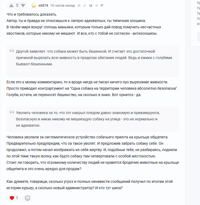 ПС. Уволить человека за то, что тот накрыл пледом давно знакомую и прижившуюся, безопасную и никак никому не мешающую собаку на улице - это не нормально и не адекватно. Кто считает иначе - поздравляю, вы радикальная шиза анти-зоо. или анти-зоо-шиза? Хз как правильней.