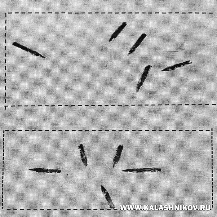 На подзаголовочной иллюстрации изображена заводская мишень с попаданиями при стрельбе экспериментальными патронами с пулей СЦТ двумя короткими очередями (верхняя и нижняя группы) на неуказанной дальности.