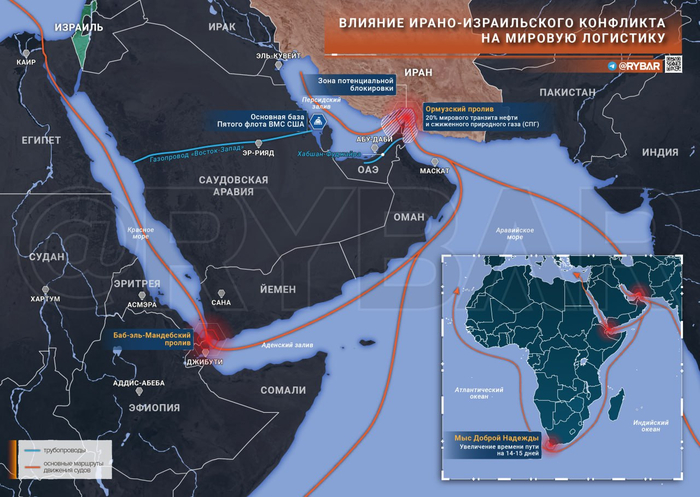 В свою очередь, Иран может перекрыть Ормузский пролив, через который на данный момент проходит 20% мировой торговли нефти и сжиженного природного газа.