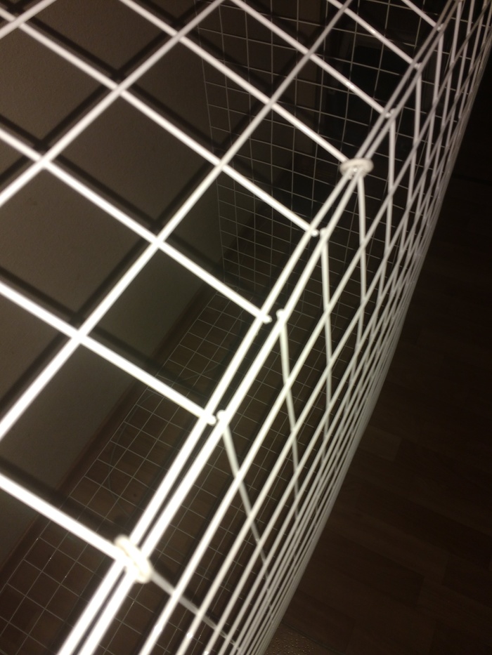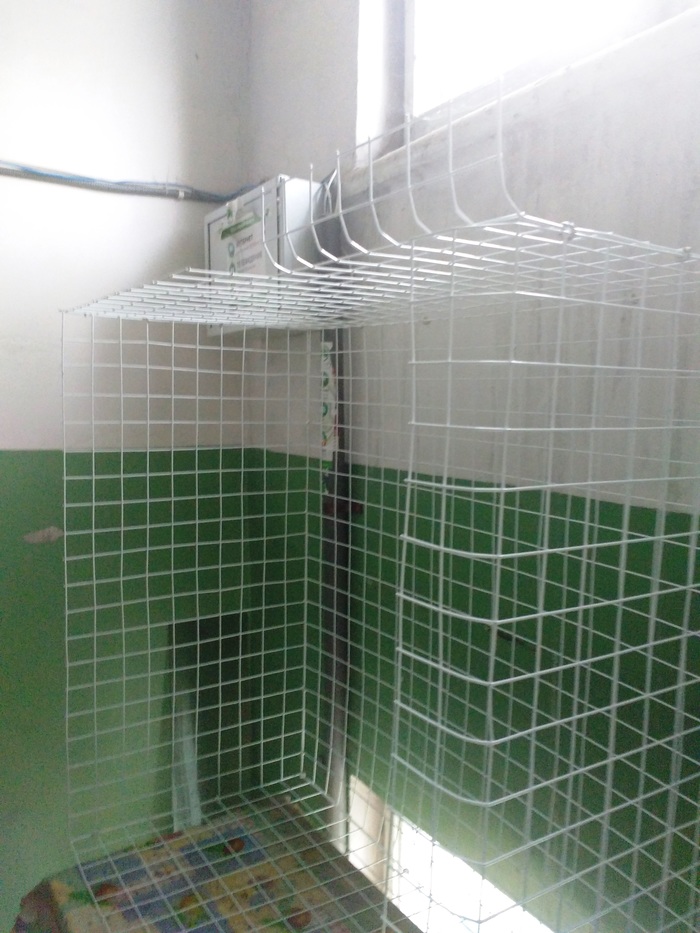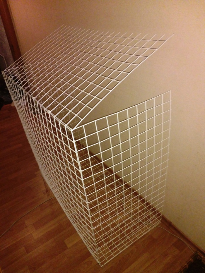 Левая половина окна у меня не открывается, поэтому сразу было задумано сделать метровую (1000х1000х500) складную клетку из торговой сетки, которую в нашем же городе и производят (2,3 или 3 мм проволока, ячейка 50х50, белое покрытие). По понятным причинам, размер проёма окна нас не устраивает категорически. :-)