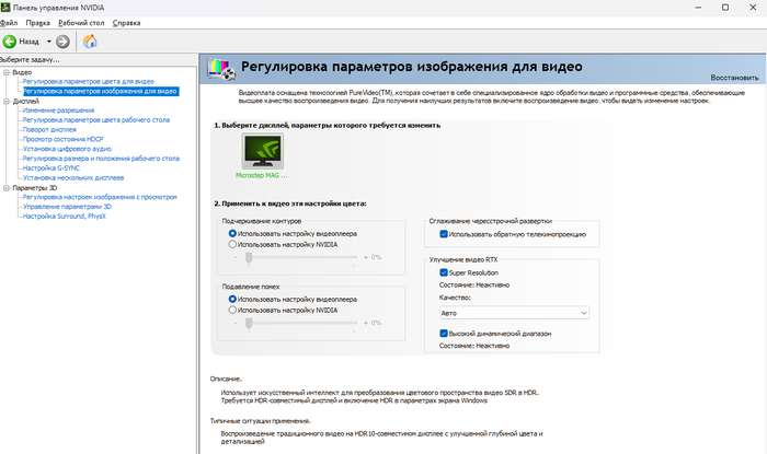 Заходим в панель управления Nvidia - Регулировка параметров изображения для видео - включаем настройку "Улучшение видео RTX Super Resolution".