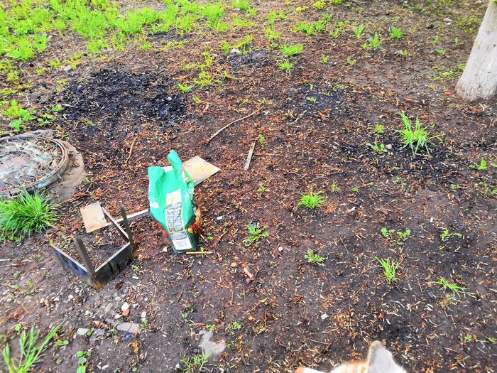 Мы видим пятилитровую бутылку, пластмассовые ведра и след от метеорита. Видно ребята пытались тушить упавшую с неба горящую массу.