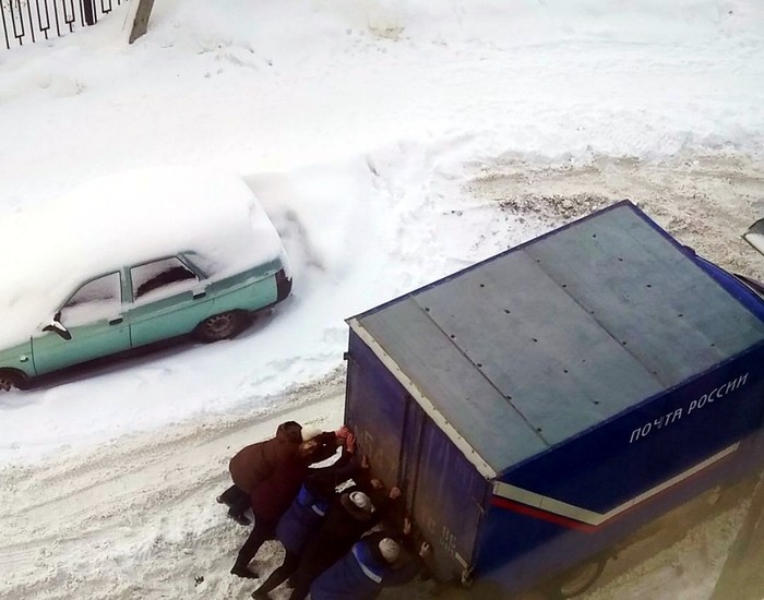 С уборкой снега чуток не справляются. И машина почты забуксовала. Под фото подпись , что женщины, толкали ее 20 минут, и в итоге вытолкали. Чтобы мы во время получили свои письма и посылки. Как говорится и в горящую избу и коня...