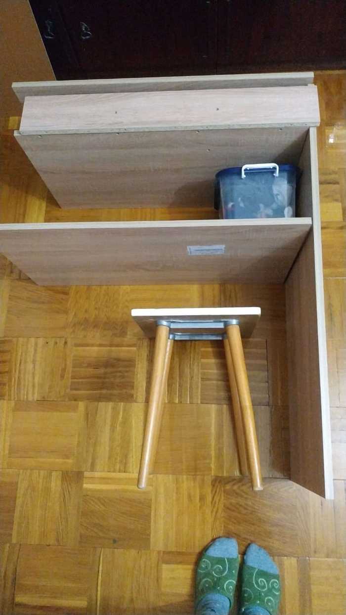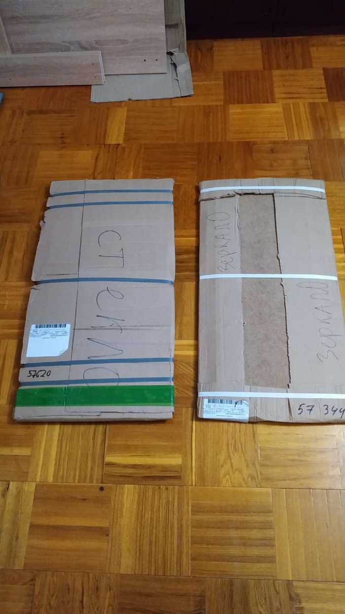 Вот так пополнилась лишними деталями наша комната... Крышки с зеркалом нет! Винтов-конфирматов тоже нет. У нас истерика. И планы собрать из лишних деталей собачью будку или стол.