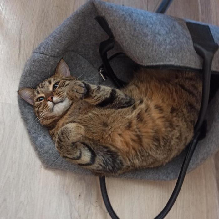 Также начал выходить из шкафа на разведку. Совершил несколько "дерзких" прогулок через комнату на крытый балкон. Посидел под кроватью. Сегодня принял вкусняшку из хозяйских рук.