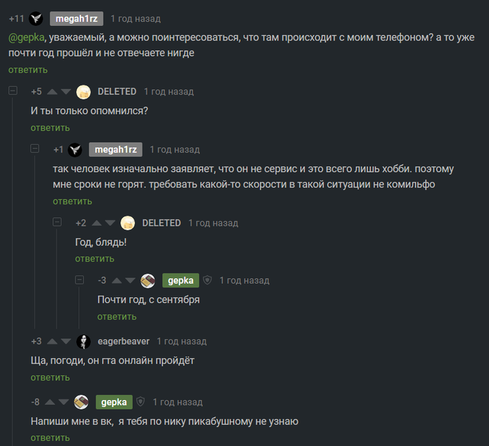 В связи с непонятной ситуацией, которую создал @gepka вынужден сообщить что он отстраняется от должности модератора в нашем сообществе. До разъяснения обстоятельств ситуации(й) а также пока @gepka не вернет людям все их гаджеты, не зависимо от их физического состояния на данный момент. После чего мы проведем голосование в сообществе о достойности им занимания должности модератора сообщества.
