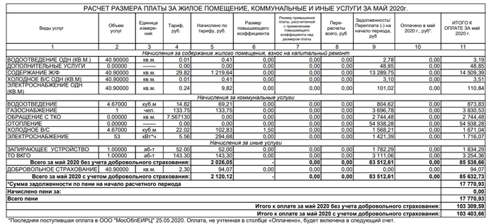 За апрель 94.5к, за май уже 103.4к? Разница практически 9к. Я звонил в МосОблЕИРЦ, где мне сказали, что они всего лишь выставляют ту сумму, которую им прислали из УК и вообще статистики у них никакой нет, ведь через них я на тот момент ни разу не платил. Вот собственно скрин расходов за Май (да, из-за долга начислились приличные пени):