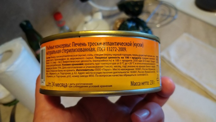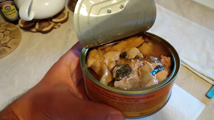 Надо было чем-то позавтракать/пообедать после бессонной ночи на удаленном объекте, сгонял в ближайший маркет, купил консервы и хлеб, в том числе печень трески. Смотрел ещё специально, чтобы печень трески была не в масле. Потому что хочется деликатесного продукта, а не машинного масла, которым её заливают.Да и я не настолько богат, чтобы платить 100-200р за банку с маслом. Как видите, масла в составе ниже нет: