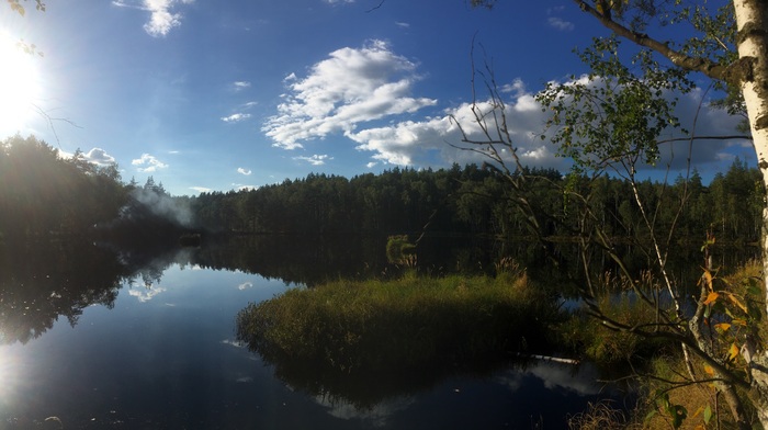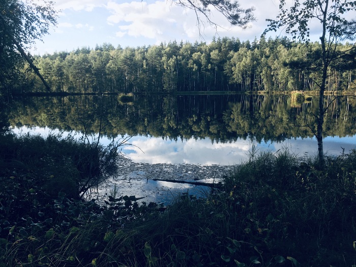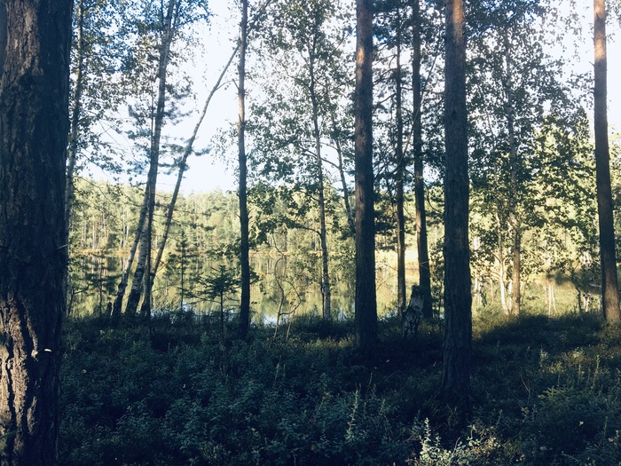 Пробираешься сквозь заросли полумертвого подлеска и сухих камышей(ведь лето не дождливое тут выдалось)и вот вдали начинает пробиваться солнце сквозь верхушки сосен. А чуть дальше березовая роща и лесное озеро с чернеющей водой-торфяное. Вглядываясь в воду, видны снующие водомерки и прочие мелкие обитатели водоема, однако,видимость не большая, теряющаяся в черноте-от того и страшно окунаться туда. А вокруг озера моховые заросли,в которые Нога утопает по щиколотку. Идти мягко, периодически попадаются оазисы ягодных кустов, которые довольно ощутимо огрызаются комариными атаками на попытки полакомиться клюквой или голубикой. Над головой яркое солноце, потихоньку собирающееся к закату. Не жарко, идеальная температура для прогулок и приятный свет для глаз. Вечереет. Рядом с озером нашли полянку, где сделали «лесной»чай и чуток позалипали,глядя на водную гладь. Назад пробирались в темноте, подсвечивая дорогу фонарями. Отличная суббота!