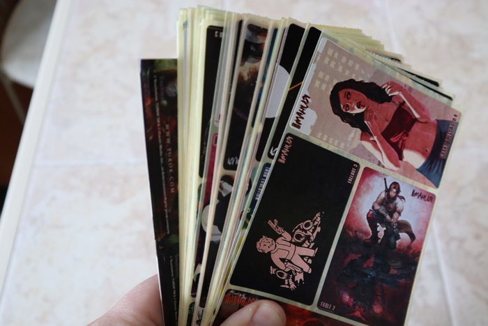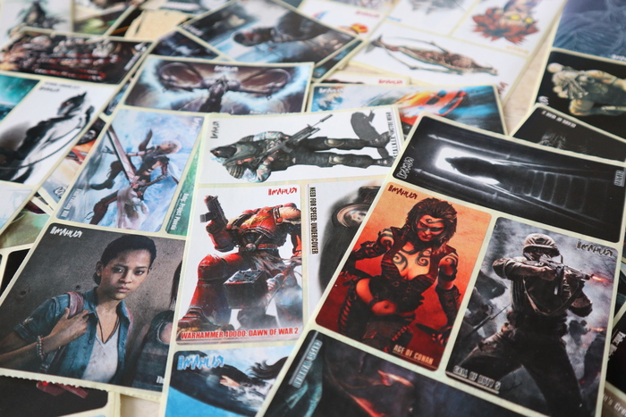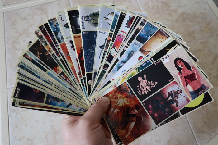Наклейки из журнала "Игромания", который к сожалению больше не выходит. Каждая наклейка прилагалась к одному журналу, безумно обожал их читать раньше. Складировал наклейки в тетрадку, но никогда не клеил. Я почему-то думал сразу о том, как неприятно будет их потом отдирать и грязь после клея чистить. Теперь лежат, как новые, даже краской ещё пахнут.