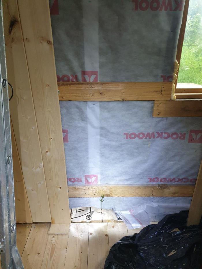 И вот что оказалось: это существо растёт действительно не из семечка, а из земли. И каким-то неведомым образом решило пролезть в щёлочку между черновым полом и вертикальным бруском, просочиться вдоль слоя гидроизоляции. Потом сквозь минеральную вату пробурить ход к свету, отогнув нехилый кусок пароизоляции! Вот она, тяга жизни!