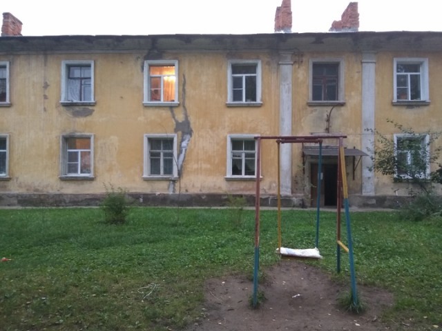 Путь к жилым домам, расположенным в центре первого острова, проходит через яблоневый сад и череду гаражей. Строения — всего три двухэтажных дома, в каждом из которых по 12 квартир, — появляются сразу за тополиной аллеей. За обшарпанной штукатуркой еще можно разглядеть следы былого великолепия — барельефы, фальшивые колонны. На подоконнике на первом этаже скучает бюст Ленина.