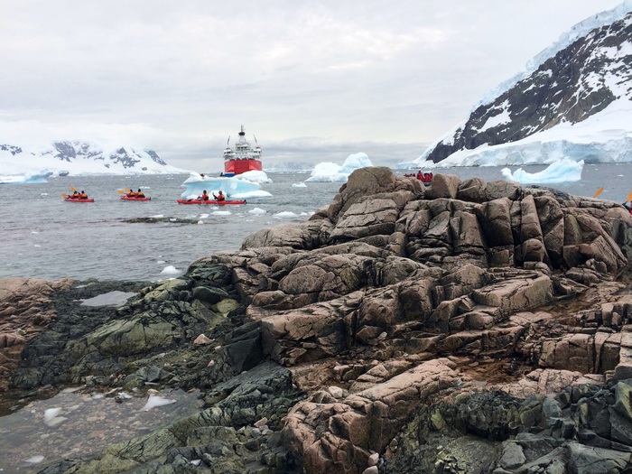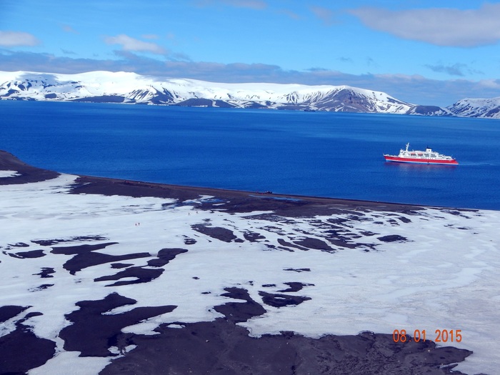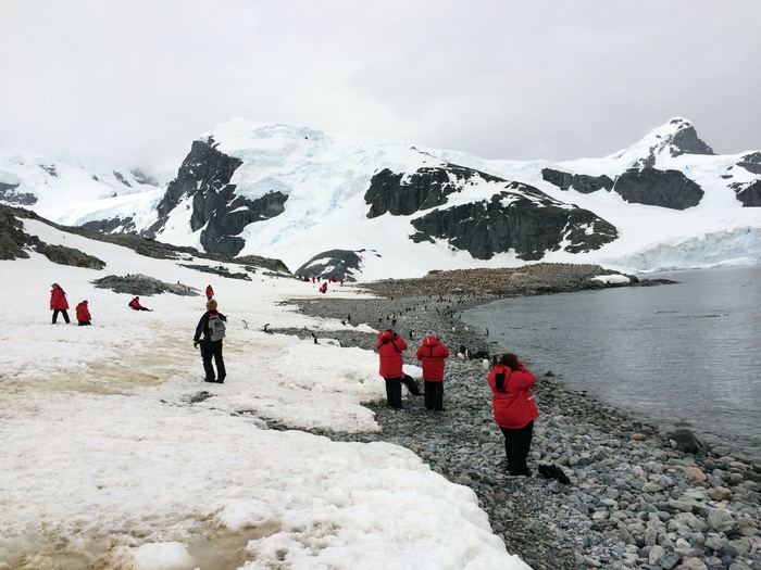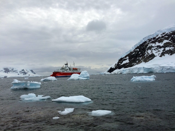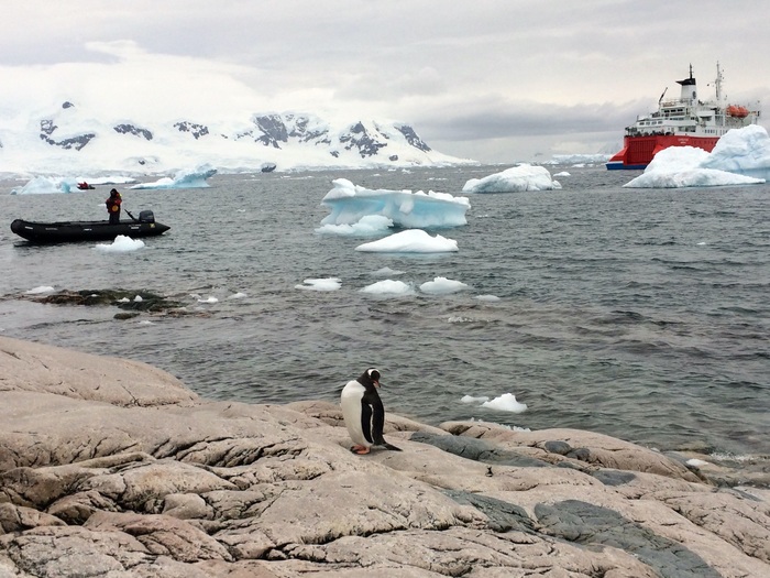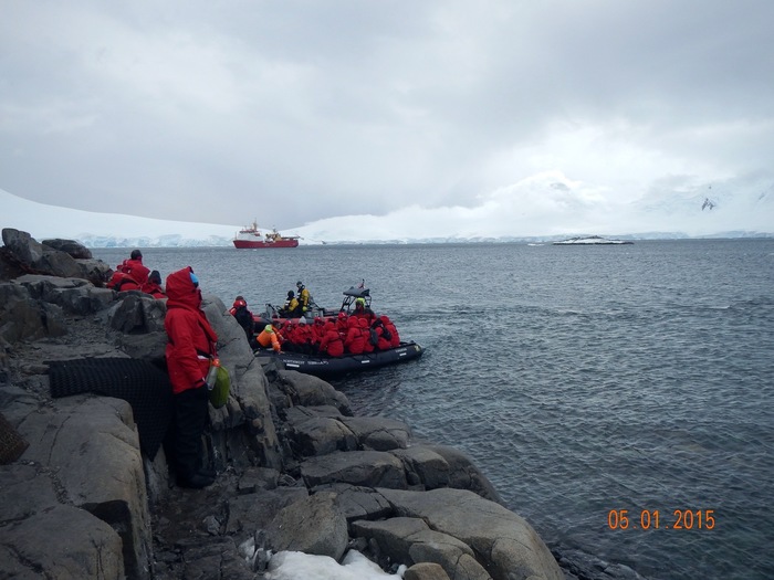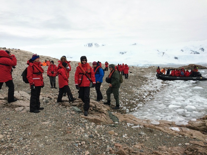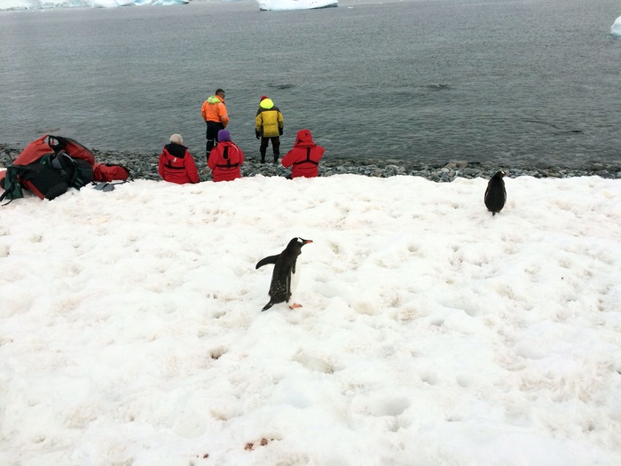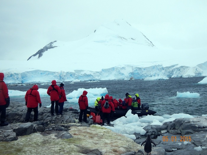 Судно встает примерно в 200-300 метрах от берега. Все точки выхода людей на острова Антарктики и саму Антарктиду строго регламентированы, поэтому все ходят по одним и тем же местам, независимо от названия компании. Соответственно, между всеми компаниями-операторами туров существует график посещаемости.