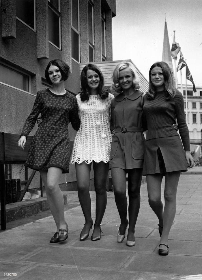 Фото сделано в Лондоне, 6 октября, 1967 года. Сфотографированы четыре модели - Sandra Kristensen, Patricia Madden, Kathleen Brown и Caroline Crosby. Фотограф Fred Mott. Называется "Четыре мини". https://www.gettyimages.com/detail/news-photo/models-wearing...