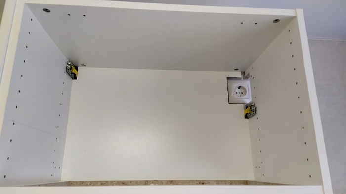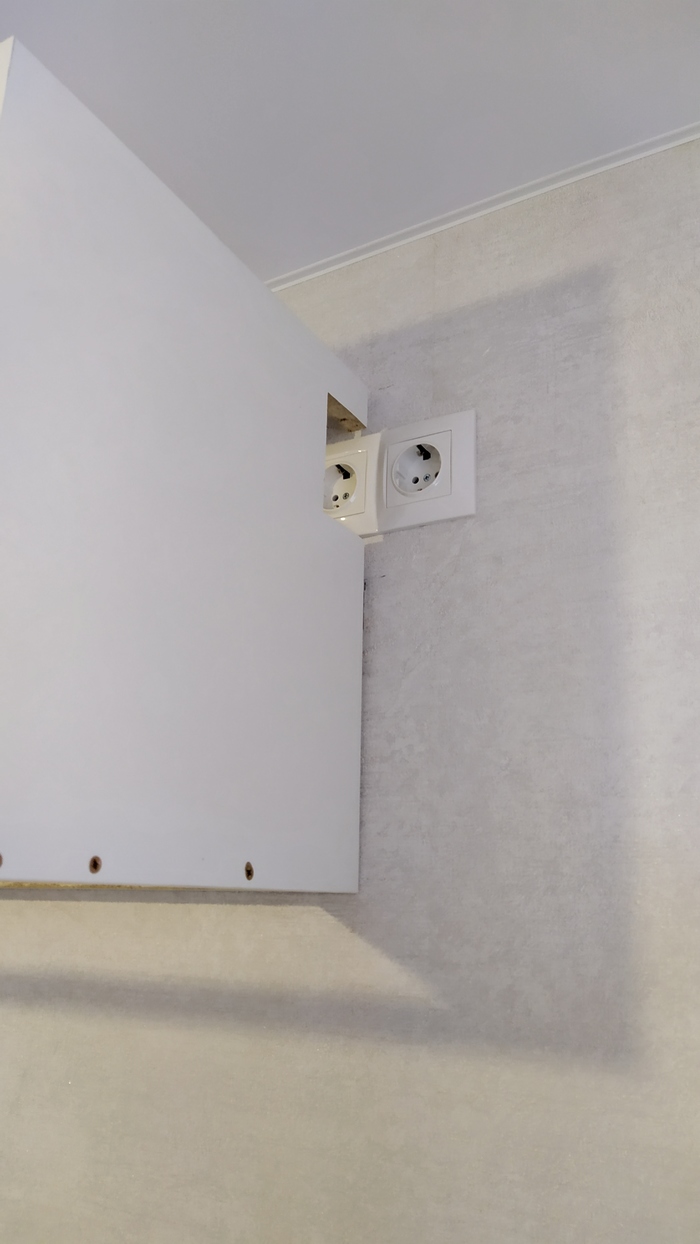 Вот такая порнография получилась. На данном этапе переделать электрику будет стоить раз в 20 дороже, чем распидорасить и подогнать под размеры сам шкаф. И заказчика спасает только тот факт, что он будет докупать сюда ещё один шкаф и розетку и все подрезы будет не видно. Ну, на жёсткости конструкции подобные подрезы не сильно сказываются. Но если бы это был крайний шкаф, то вменяемого решения я не знаю...