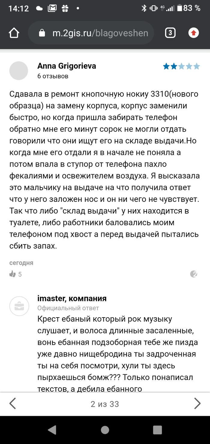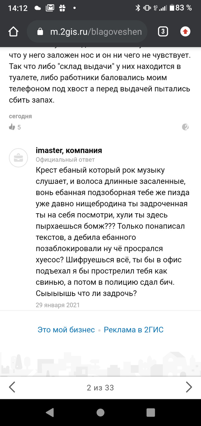 Меня удивляет политика 2гис. Человек всех кроет хуями и его ответы висят в официальных ответах. А люди про кодило пишут и их в Бан.