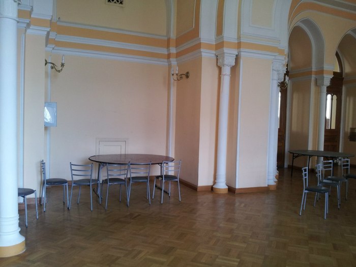 Это холл на втором этаже перед выходом в главный зал. Там над столами висела доска, и перед ней стояли парты, здесь у нас тоже был класс.