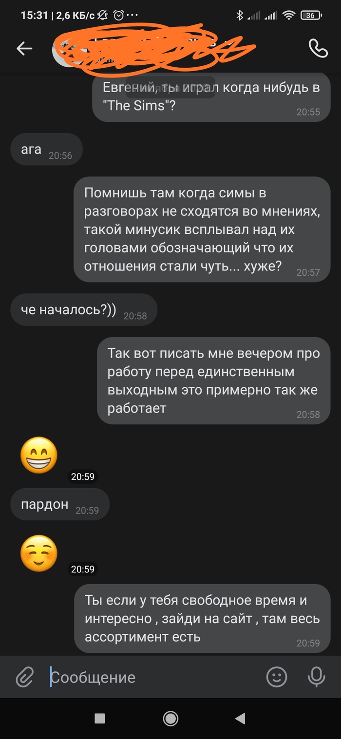 4052 gayarsenic Ответ на пост «Эти вечерние вопросы по работе...» 5 лет назад Я тоже очень люблю вечерние вопросы по работе ) Он ещё потом ответил что-то типа "ничего себе, поздравляю, а когда сможешь?"Переписку скринила для друзей, этот остаток разговора на скрин уже не попал. Показать полностью 2 [моё] Работа Клиенты Скриншот Переписка Ответ на пост Длиннопост 35 13 2 Ещё 0