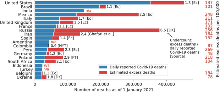 По показателю расхождения данных с нашими 6,5 раза не может соперничать даже Боливия в 3,5 раза (не показана в таблице), Мексика (2,5 раза) или Польша (2,9).И если мы возьмем всю смертность с росстата (в том числе с раздела "COVID-19 не является основной причиной смерти и не оказал существенного влияния на развитие смертельных осложнений заболевания"), то превышение смертности будет 264 100 / 116 054 = 2,28.