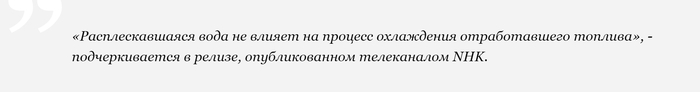 По данным телеканала, аналогичная нештатная ситуация произошла на пятом энергоблоке аварийной АЭС «Фукусима-1», где расплескалось около 600 миллилитров воды и около 1,6 литра жидкости из бассейна шестого энергоблока.