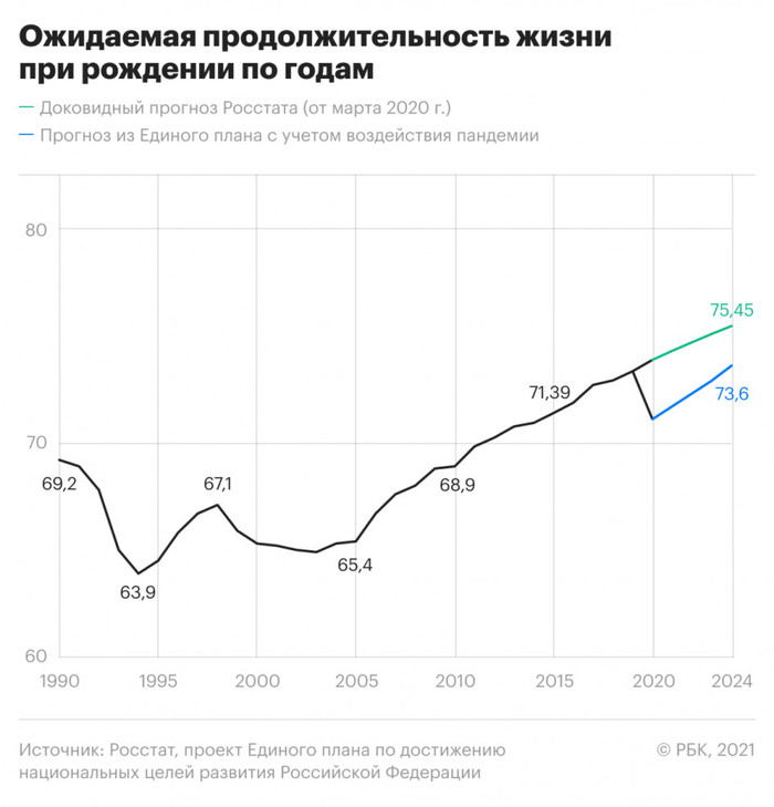На фоне пандемии ожидаемая продолжительность жизни в России снизилась впервые с 2003 года, следует из мартовской версии правительственного плана по достижению национальных целей. В 2030 году показатель должен составить 78 лет