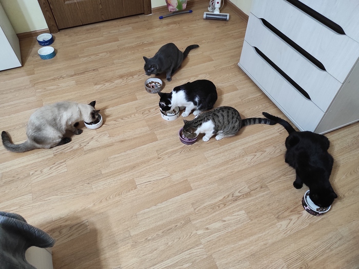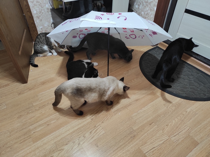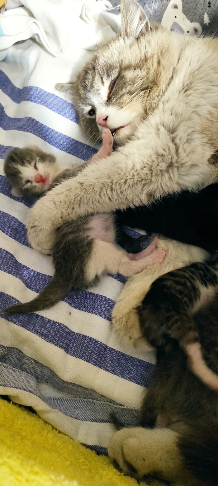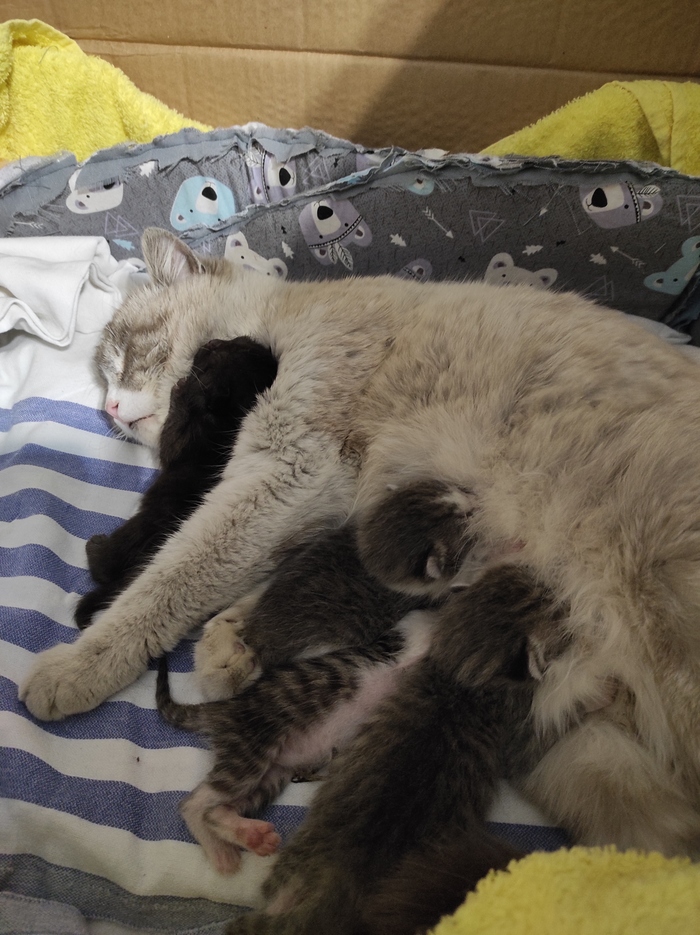Около 3 х месяцев кормила подъездную кошку, и все с мужем удивлялись- вроде уличная, грязная, а такая толстенькая. Вчера, по традиции, возвращаясь домой, кыскыскаю уличницу, нигде нет, думаю, ок-гуляет. Только к лифту подходить, несётся, а из цокольного этажа доносится сильное пищание. Сначала думала, может котенок застрял, пошли на пару с котейкой искать, нашли в грязи 4 х милейших, слепых с висящими пуповинами, котяток. На котейку гляжу, уже не такая толстенькая. Покормила я мамашу, и пошла рыдая домой, с мужем решили, учитывая наших 5 котов, 1 комнатную квартиру, что всех не спасешь, буду дальше кормить, а там уже как выживут, так выживут. Решение прожило около 3 часов, после чего забрали их домой, максимально утеплили коробку из под системника, обложили кариматами и тд., поселили на балкон. Как на зло, похолодало у нас на днях, вроде на юге Казахстана, но ночью нормальный минус, пришлось сейчас пожертвовать кухней, психическим состоянием пушистых резидентов и перенести в тепло, на днях должно потеплеть до нормального плюса. Балкон, к слову, не утепленный, просто застеклен. Такие дела, пикабушники, через месяц буду писать посты с просьбой взять в добрые руки котяток и маму, маму стерилизуем, но это потом, сейчас нормально стресса. Надеюсь, что выживут зверята маленькие, мама плохо ест, в шоке, но ничего, насильно пою ее и кормлю, чтоб было чем детей кормить.