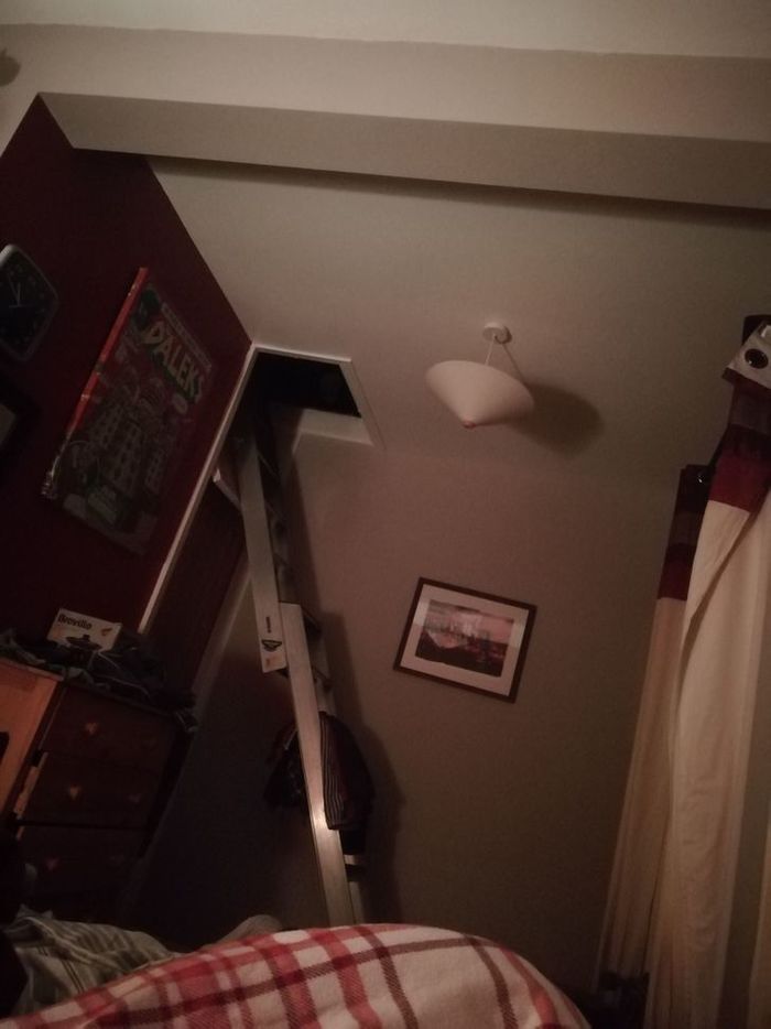 Когда мне было 13, я перебралась в спальню брата. Изначально это была крохотная кладовая с выходом на чердак, но потом ее расширили, а открытый люк и лестница остались. Через несколько недель я стала просыпаться посреди ночи и видела смотрящую на меня фигуру. Она медленно спускалась к изножью моей кровати и смотрела на меня, но пропадала, как только я начинала шевелиться. Я никому об этом не говорила, а со временем это стало происходить реже. Но через 8 лет мой брат во время нашей встречи упомянул, полушутя, что видел кого-то, когда жил в этой комнате.
