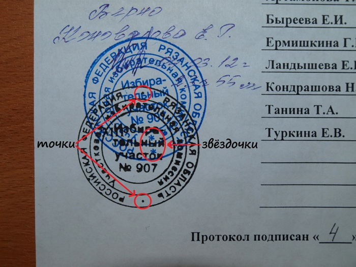 Однако по трем участкам, где результаты расходятся, оттиски печатей совпали — звездочек нет, только точки. Это участки 1014, 1015 и 1025 в Октябрьском районе Рязани.