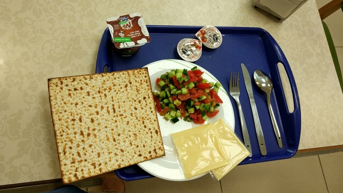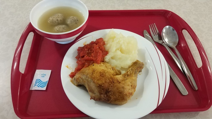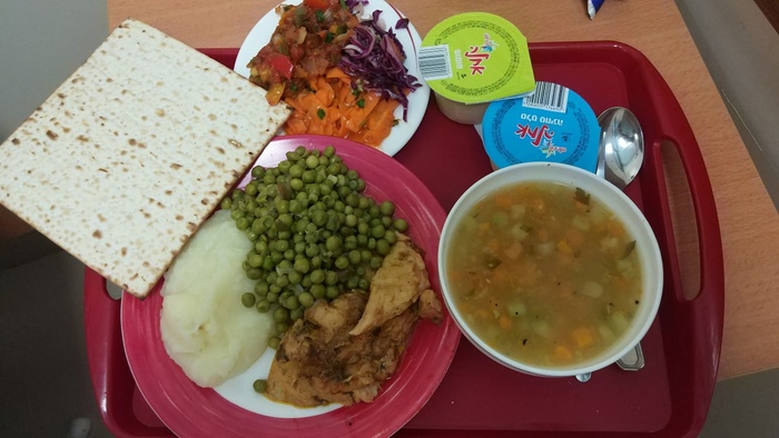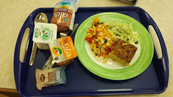 Вообще там хорошо кормят. Несколько блюд на выбор. Когда я там была, был Песах, и вся еда постная. Кстати, никаких диет кормящих мам в Израиле нет. Главное питаться вкусно и сбалансированно по аппетиту. В баночках различная кисломолочка, шоколадный пудинг, джемы, а ещё там есть халва и шоколадное молоко. Чай и кофе доступны 24/7 в столовой зоне.