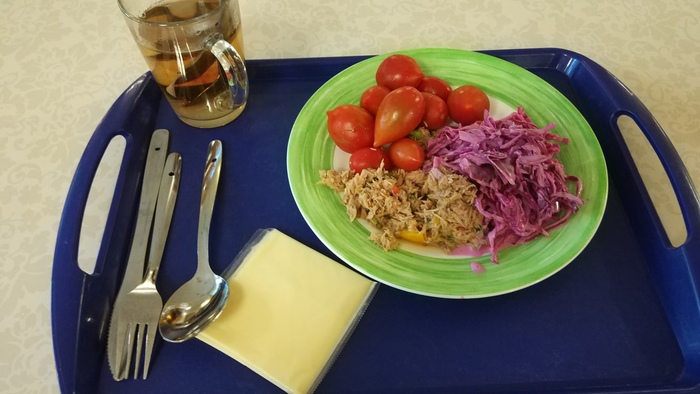 Родила я в 9 утра, так что завтрак пропустила. На момент обеда была очень голодной, но дойти до столовой сил не было, так что обед мне принесли в палату) Персонал не знал моих вкусовых предпочтений, поэтому принесли всё, что было представлено на обеде 😑 на ужин я уже выползла сама.