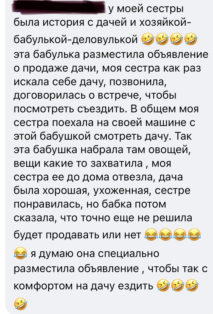 Мы так с другом ему дачу покупать ездили .. созвонились с продавцом, забрали его в городе. Приехали на место.. все понравилось чуть поторговались, забрали какие то закатки.. по дороге хозяин предложил отметить это дело.. купили пузырь замочили.. в условленное время хозяин дачу продавать не захотел. Расстроились конечно.. но что делать... бывает. Как Вы сами понимаете объявление ни кто не стал убирать. Позвонили с другого номера .." дача продается " "посмотреть можно". Ах ты ж.. подумали мы. и решили отомстить. Опять по накатанной правда другим составом, забрали его .. отвезли на дачу, забрали закатки, на обратном пути "решили" отметить.. на этот раз в кабаке по пути.. хорошо посидели.. на широкую ногу, правда Вот счет не дожидались в этот раз.. оставили хитрована одного в кабаке. Закатки выставили на парковке. Через 30 минут "товарищ" звонил.. но мы сказали , что передумали покупать дачу.