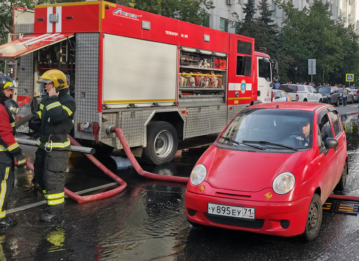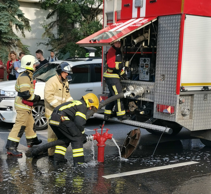 Из машины достали кучу шлангов разных калибров, непонятный тройник и все подтянули ко входу в паркинг. Дальше шлангов не тянули. Видимо в паркинге достаточно пожарного инвентаря, а это приготовления на случай если все пойдет плохо.