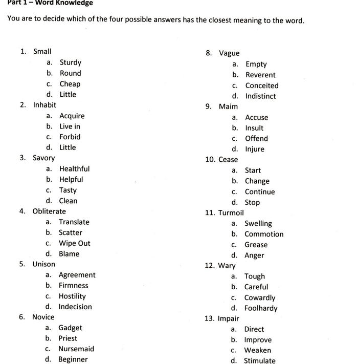 Word Knowledge (WK) - 35 questions with an 11 minute time-limit.