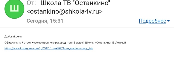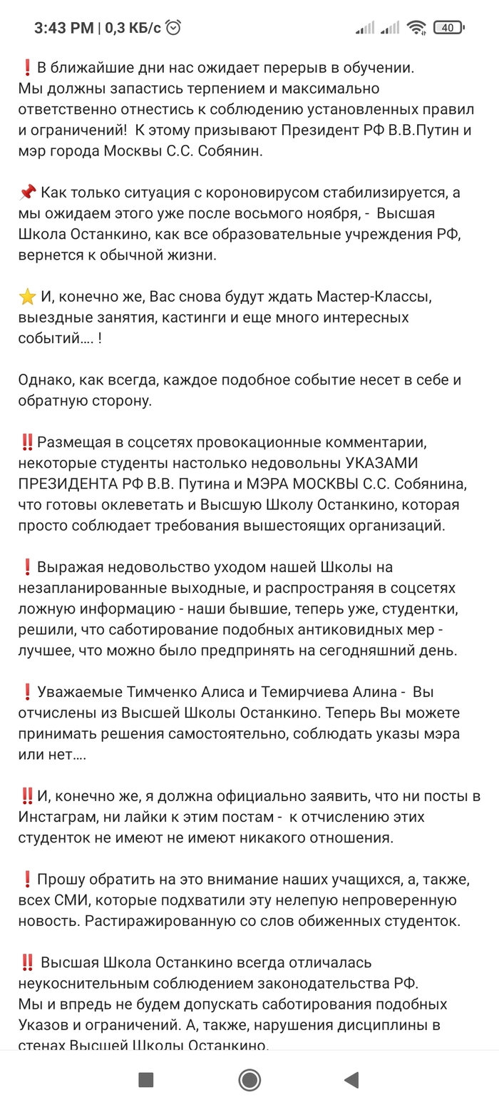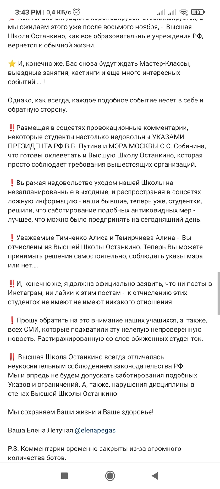Ответ на пост «"Высшая школа Останкино" отчислила несколько студентов ЗА ЛАЙКИ НА КОММЕНТАРИИ в инстаграме, критикующем учебное заведение»